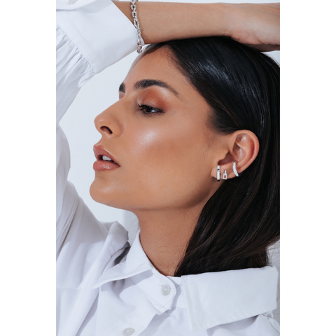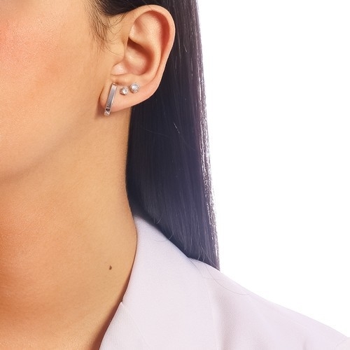 Se você tem mais furos e gosta de usar uma orelha mais cheia de brincos, uma ótima opção é combinar com outros brincos como na foto, ou também colocar o nosso ear hook prata cravejado, fica lindo.